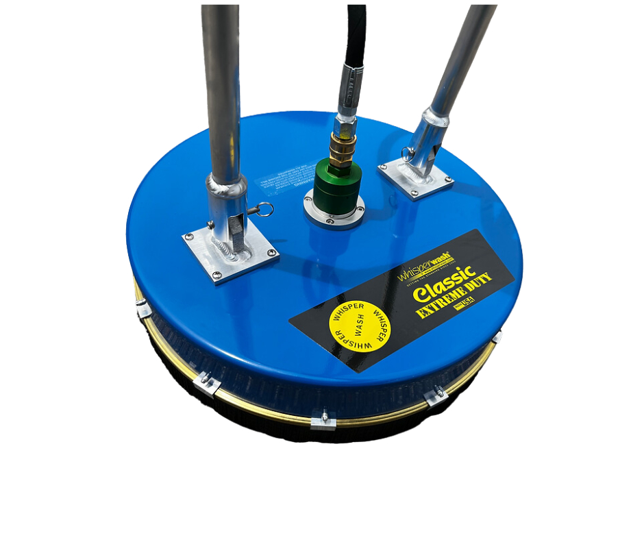 The WW3000 Classic Extreme Duty 19 inch Whisper Wash Surface Cleaner is the perfect accessory to your pressure cleaner if your regular cleaning jobs include: Patios, Pool decks, Parking lots and other Large Flat Surfaces. The Whisper Classic is less tiring for the operator and provides more safety through it’s ergonomic design.